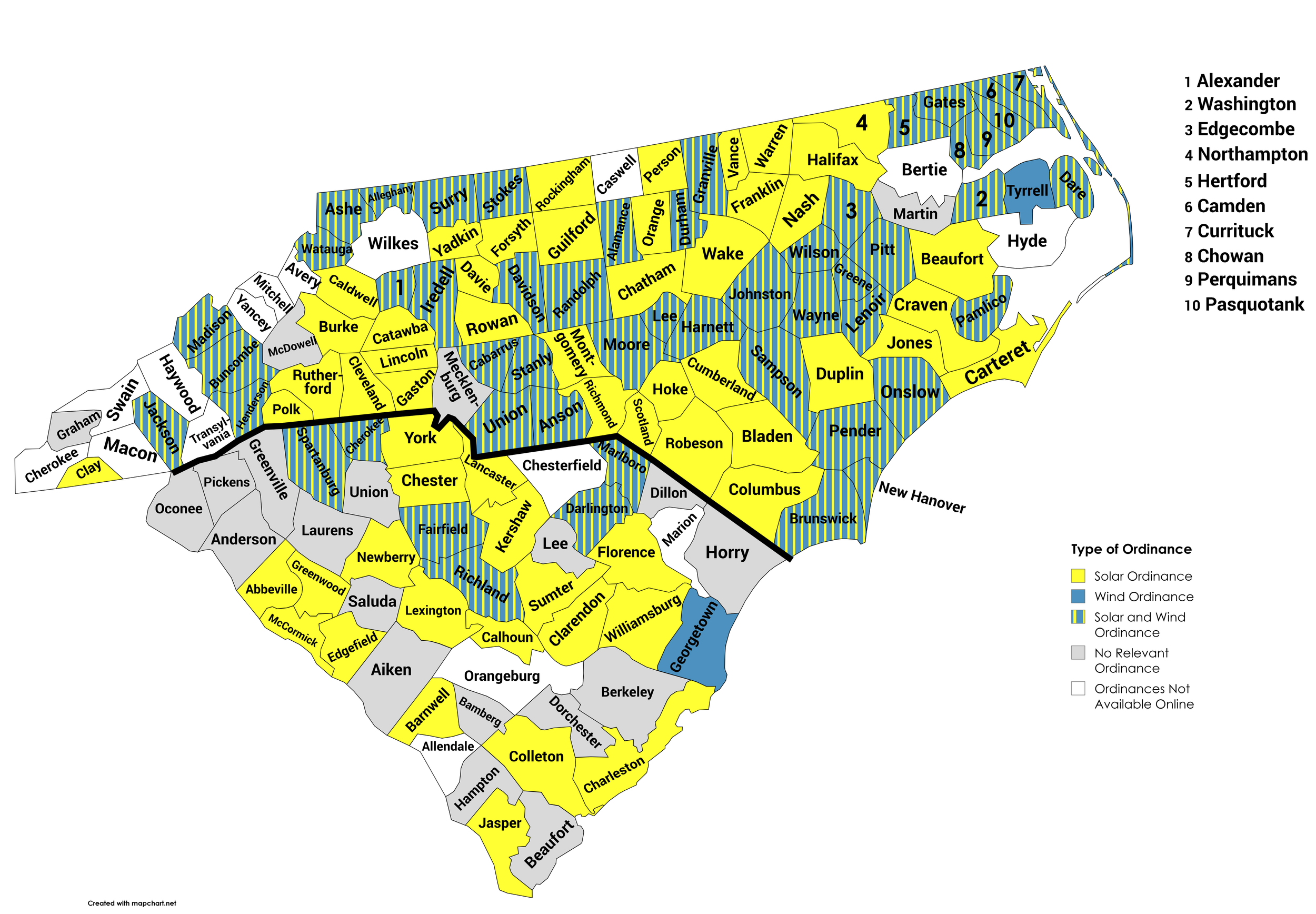 While this discussion focused on North and South Carolina, it represents a larger national trend of variance in the regulation of utility-scale solar and wind energy facilities regardless of states’ proximity to each other. This variance continues on a more granular level within each state. This can make it difficult for developers looking to invest in and build out new renewable energy facilities. If states, and the country as a whole, are to meet their clean energy goals, more clarity, transparency, and accessibility will be required when it comes to local ordinances.